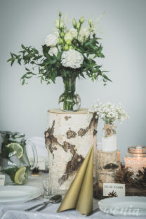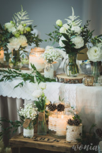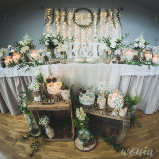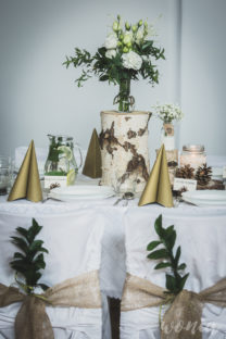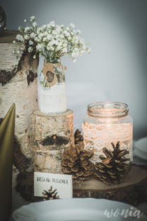 Sala została wypełniona stołami dla gości, na środku zawisł wieniec ozdobiony zielenią i kwiatami a scenę dodatkowo rozświetlił napis LOVE 🙂 Na stołach pojawiły się klasyczne dla rustykalnej dekoracji elementy takie jak, pieńki i plastry drewna, wazoniki z koronką, szyszki i oczywiście kwiaty a tym razem wybór padł na goździki, eustomę, tawułę, eukaliptus i ruskus. Całość wypełniały winetki z szyszką czyli nasze ulubione „szysznietki” oraz złote serwety. Dodatkowo na krzesłach zawisły gałązki ruskusu przewiązane jutową kokardą.