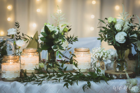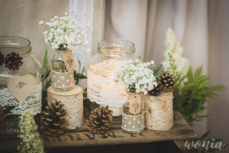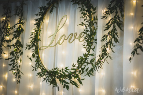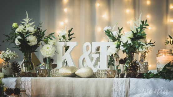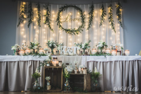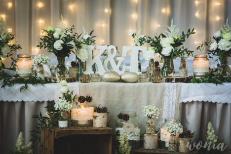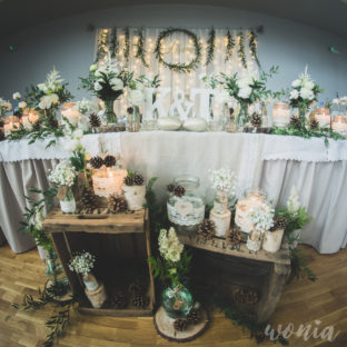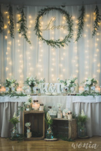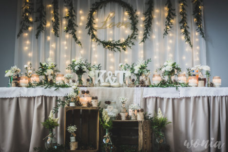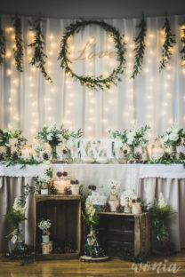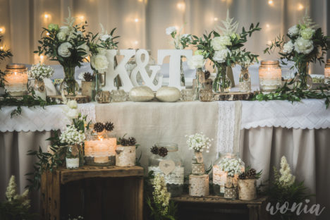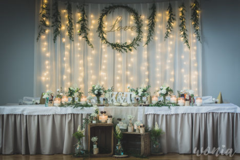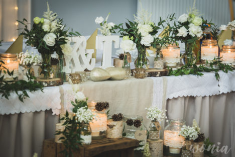 Na sali pozostał nam jeszcze ostatni ale najważniejszy element czyli dekoracja stołu prezydialnego. Tutaj wykorzystaliśmy nieco więcej elementów, jak różnej wielkości słoiki, stare drewniane skrzynie, małe świeczniki o oczywiście bukiety w nieco większym rozmiarze. Na środku pojawiły się inicjały państwa młodych i złote serca. Za plecami, na ścianie zawisły klimatyczne żarówki, zasłonięte prześwitującym materiałem i kolejne gałązki ruskusu, całość przestrzeni za Parą Młodą dopełniło koło z napisem Love.