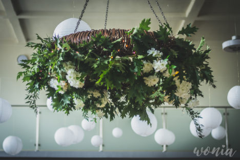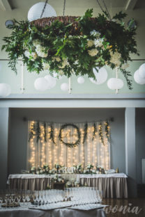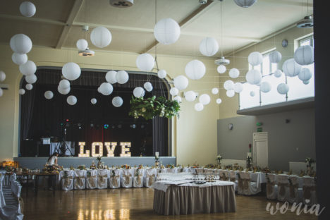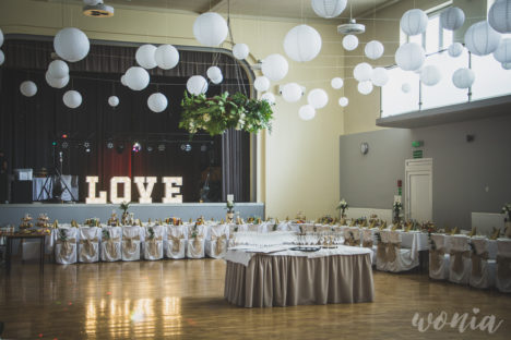 Sala w Porąbce jest dość duża i wysoka więc priorytetem było nieco ją pomniejszyć! W tym celu zgodnie z marzeniem Pani Młodej na balkonach zawisły papierowe lampiony, które nadały świetnego klimaty przy okazji dość znacząco „obniżając” sufit. Efekt był rewelacyjny choć kosztował nas naprawdę sporo sił, ale… warto było!