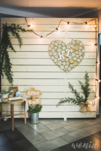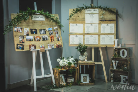 Jakby tego było mało gości witała drewniana ścianka do zdjęć wykonana przez jednego ze znajomych Państwa Młodych, którą my poddaliśmy lekkiemu liftingowi dodając zieleń, żarówki i drewniane serce. Kawałek dalej czekała tablica z ustawieniem stołów i kilka wspominkowych memoprintów 🙂