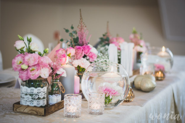 W pierwszym momencie można pomyśleć, że styl rustykalny i sala w Dworze Świętoszówka to dwie różne bajki… ale jak dodamy trochę złota, trochę elegancji a zamiast słoików użyjemy szklanych wazonów i wszystko zaczyna nam się układać w całkiem niezłą całość.