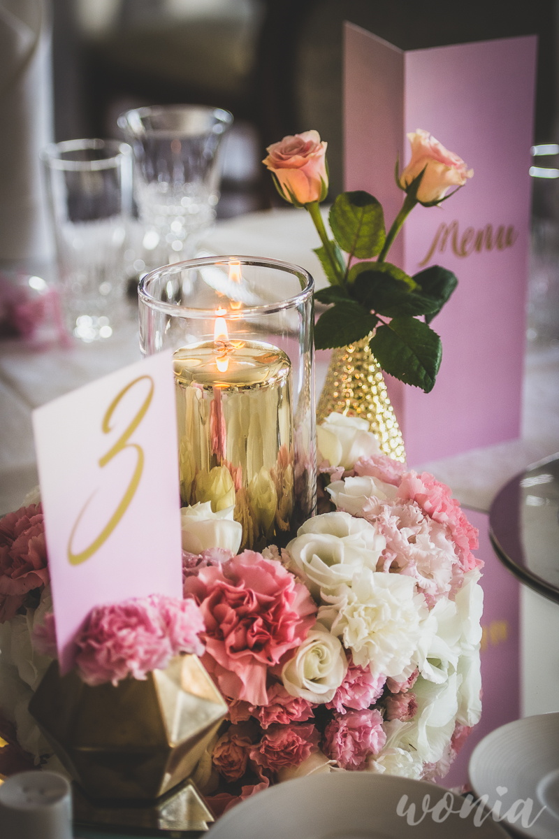 Wszystko zostało uzupełnione zieleniną z eukaliptusu i ruskusu. Dodatkowo na stole prezydialnym pojawiły się piękne różowe hortensje w szklanych kulach. Skoro miało być złoto, nie mogło zabraknąć lustrzanych świec oczywiście w kolorze złotym. Pojawiły się również złote inicjały, wazoniki i lustra które świetnie wypełniły naszą dekorację.