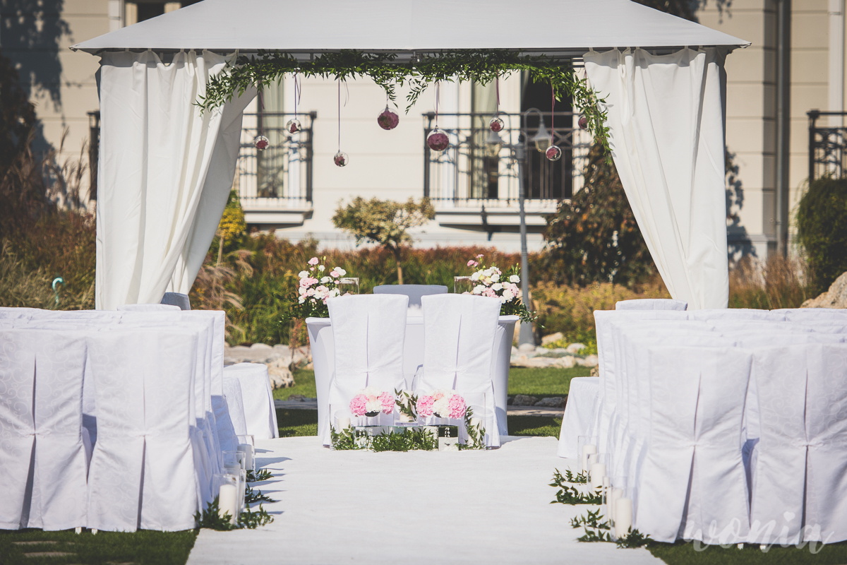 Tym razem ceremonię stanowił ślub cywilny, który odbył się w ogrodzie hotelu, oczywiście i tam nie mogło zabraknąć dekoracji! Świece na „drodze do ołtarza”, klilka kwiatowych kompozycji i szklane kule z goździkami elegancko wypełniły plenerowy ślub!